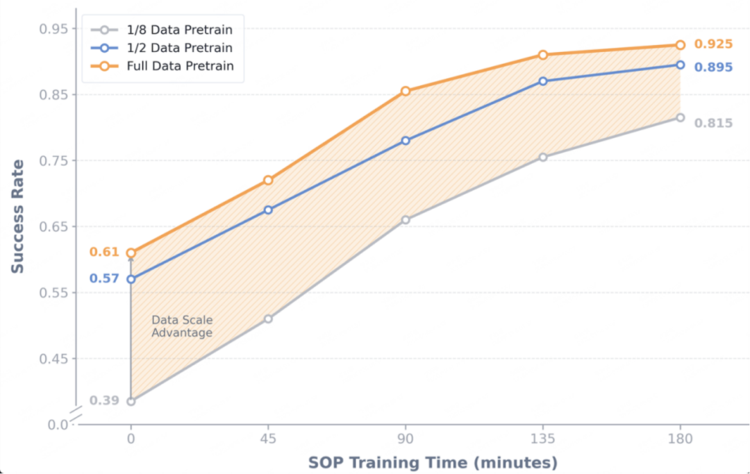 研究发现,预训练的规模决定了基座模型和后训练提升的轨迹。SOP 能为所有初始模型带来稳定的提升,且最终性能与VLA预训练质量正相关。