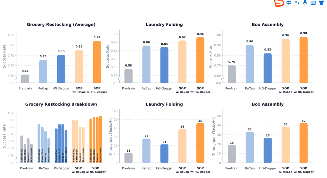结合SOP的HG-Dagger方法让叠衣服的相比HG-Dagger吞吐量跃升114%。SOP让多任务通才的性能普遍提升至近乎完美,不同任务的成功率均提升至94%以上,纸盒装配更是达到98%的成功率。