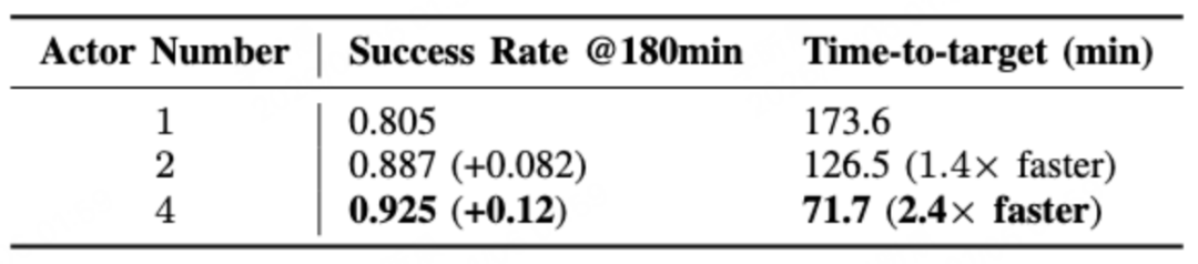 智元使用了三种机器人队伍数量(单机、双机、四机配置),在同样的数据传送总量的基础上,进行了比较。实验结果表明,在相同的总训练时间下,更多数量的机器人带来了更高的性能表现。在总训练时间为3小时的限制下,四机进行学习的最终成功率达到了92.5%,比单机高出12%。
