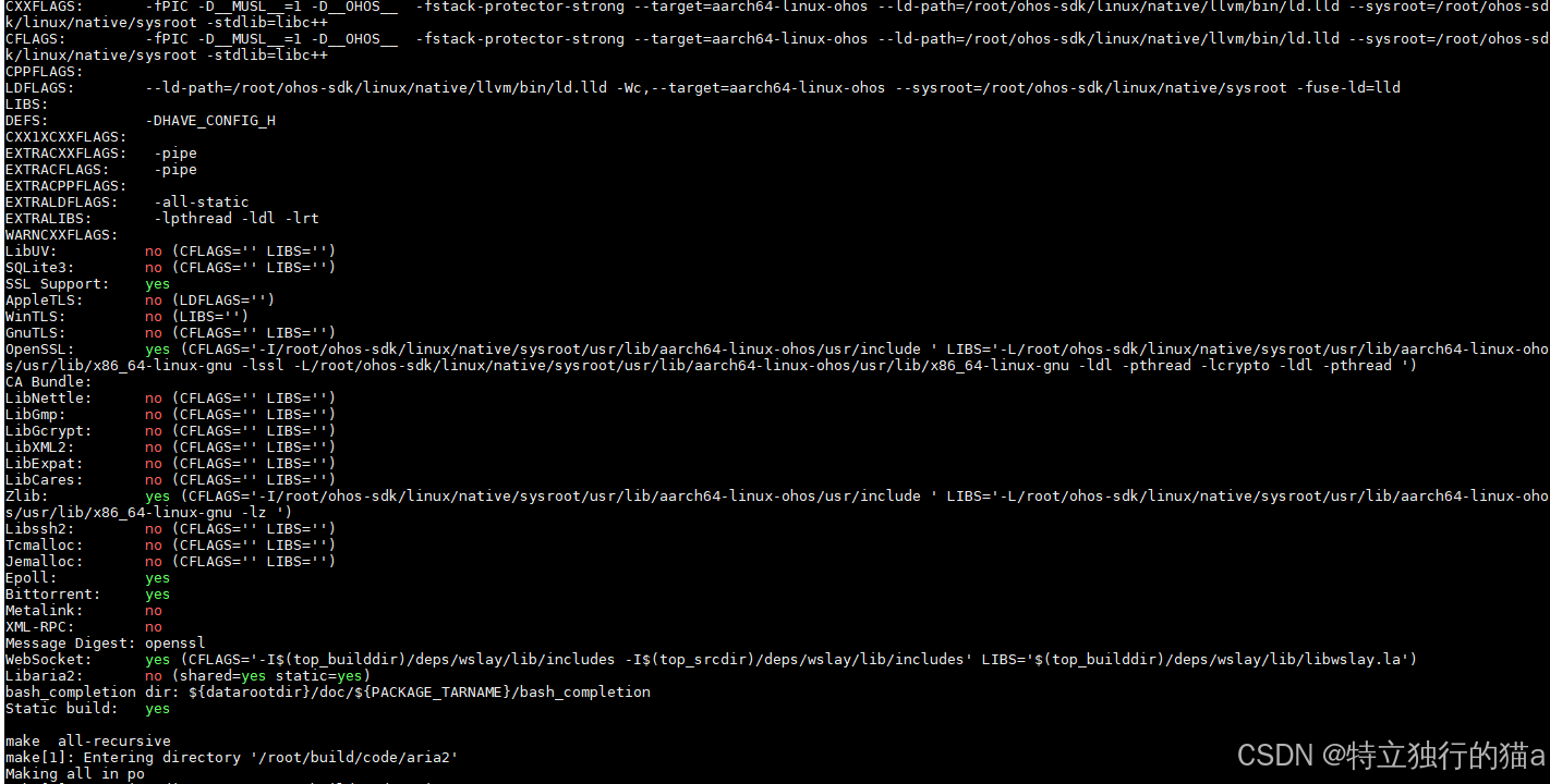 随着鸿蒙生态(OpenHarmony)的迅速发展,越来越多的应用程序需要高效的文件下载和同步功能。Aria2,作为一款开源、轻量级的多协议、多线程命令行下载工具,其在处理大文件传输、镜像同步和自动化下载任务方面具有显著优势。本文将详细介绍如何将 Aria2 移植到鸿蒙 PC 平台(aarch64),并解决移植过程中可能遇到的技术挑战。