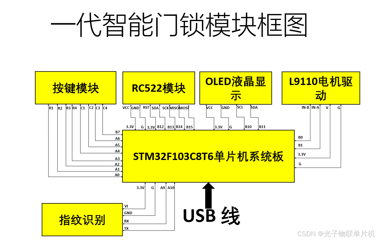 信号线连接:4*4矩阵键盘线接到单片机的PA0,PA1等的引脚。L9110S模块接单片机的PB0,PB1引脚。指纹识别模块接单片机的串口通讯引脚PA9,PA10引脚。液晶显示模块接单片机的PB10,PB11引脚。RC522刷卡模块接单片机的PB12~PB15引脚。