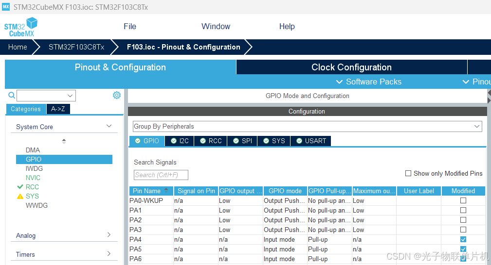 4*4矩阵按键的原理就是通过8个端口与单片机连接,4个IO口控制行,4个IO口控制列,如下图所示。键盘的R1,R2,R3,R4接单片机的PA0,PA1,PA2,PA3脚,单片机这几个脚配置成输出。