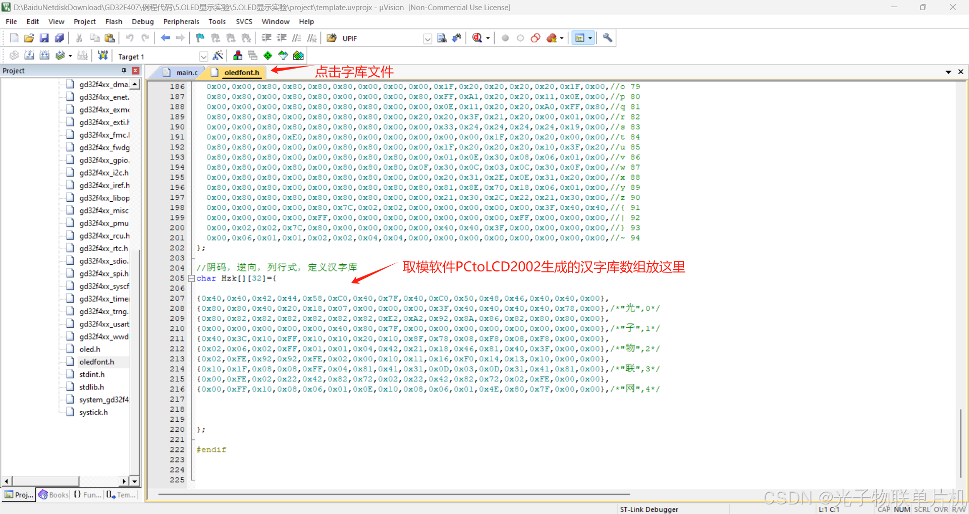 上面的"光"字的C语言数组如下也是用PCtoLCD2002 软件生成的。