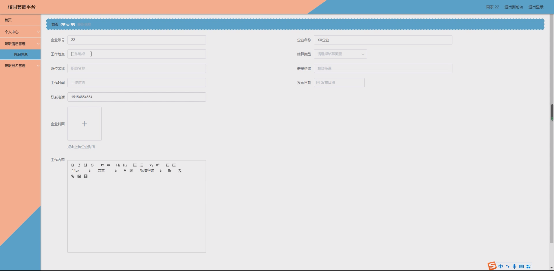 该模块主要实现兼职信息的发布、审核、查看、修改、删除等功能。商家登录后可发布兼职信息,包括岗位名称、工作内容、工作时间、薪资待遇、招聘人数、任职要求等。发布的兼职信息需经管理员审核通过后才能在平台展示。用户可通过关键词搜索、分类筛选等方式查看兼职信息,了解岗位详情。