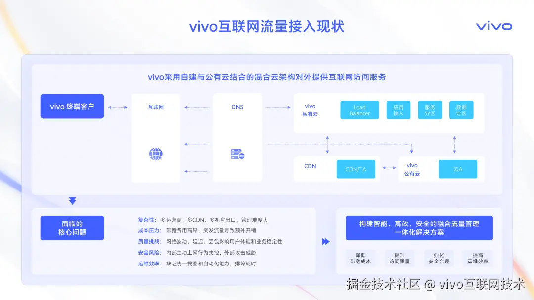 vivo采用了自建私有云和公有云结合的混合云架构。用户的访问流量,会通过DNS、CDN、负载均衡等一系列网络基础设施,最终到达我们的业务服务。