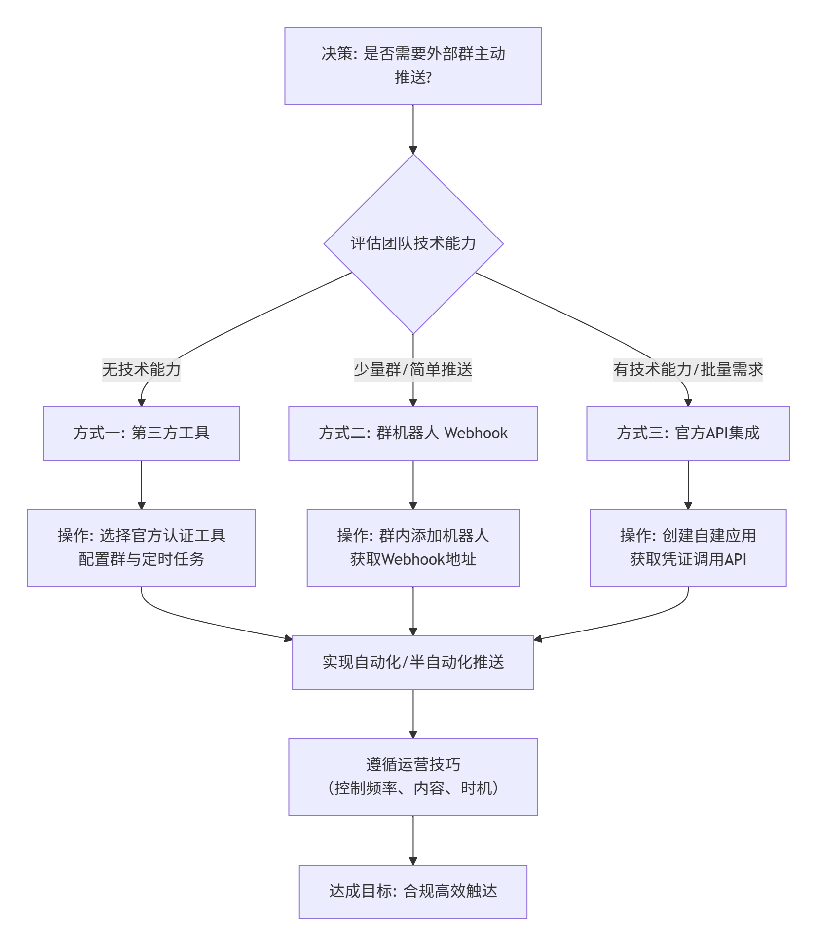 不同于内部群简单的 Webhook 机器人,外部群的推送涉及更高标准的权限管理和合规校验。本文将从技术方案选择、核心接口调用及规避"被拦截"风险三个维度进行分享。