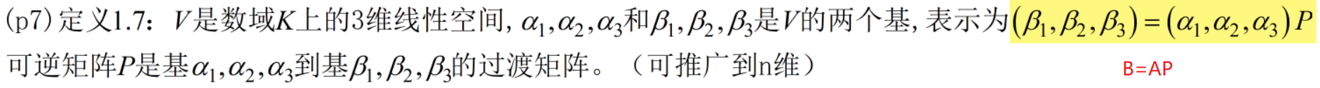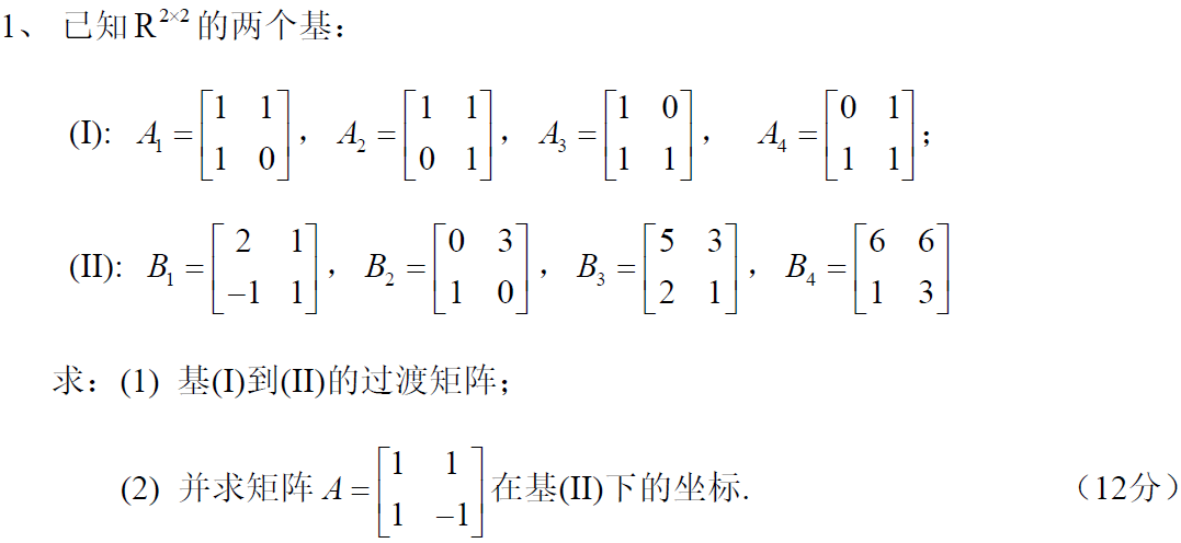 6 求一组基到另一组基的过渡矩阵,并求某一元素在某组基下的坐标。12分【第一章】