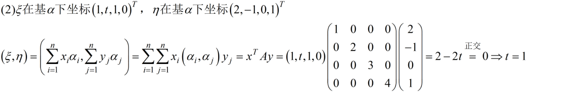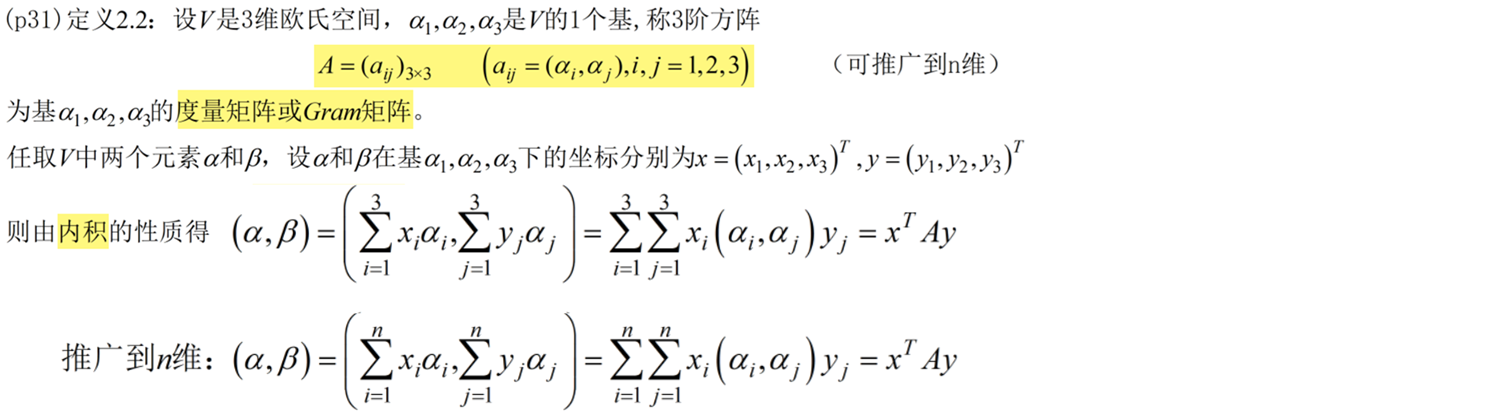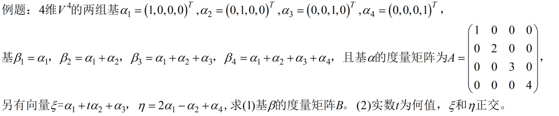 7(1)在线性空间当中定义某一个内积,知道某一组基下的度量矩阵,去求另一组基上的度量矩阵,(2)确定参数使两向量正交。12分【第二章】只用看P31页