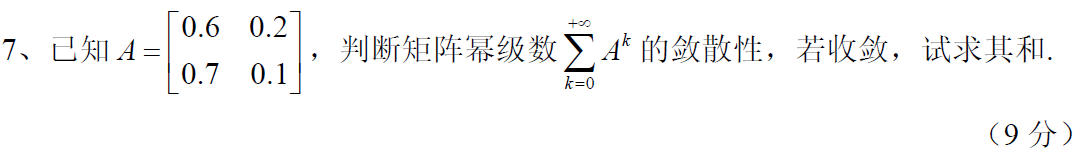 10 判定矩阵幂级数的敛散性,如果收敛,求和。7分