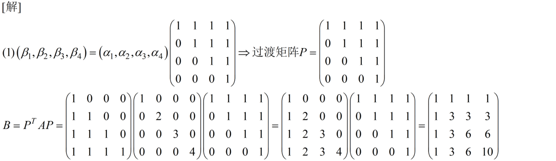 求过渡矩阵 :先设过渡矩阵为P,再取简单基后将题给的基都用简单基表示,接着化简代入其中一个式子,使其表示为AP=B的形式。注意题给的是矩阵基,二维矩阵基有4个元素,每个基的元素是以Z字形竖着写成向量样式组成的矩阵。