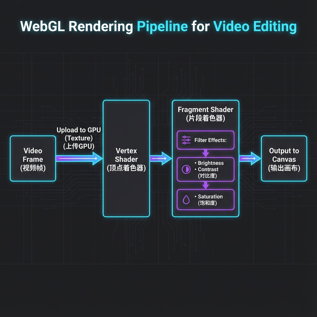 简单来说:视频帧上传到 GPU → 经过着色器处理(加滤镜)→ 输出到画布。
