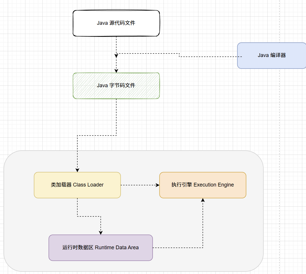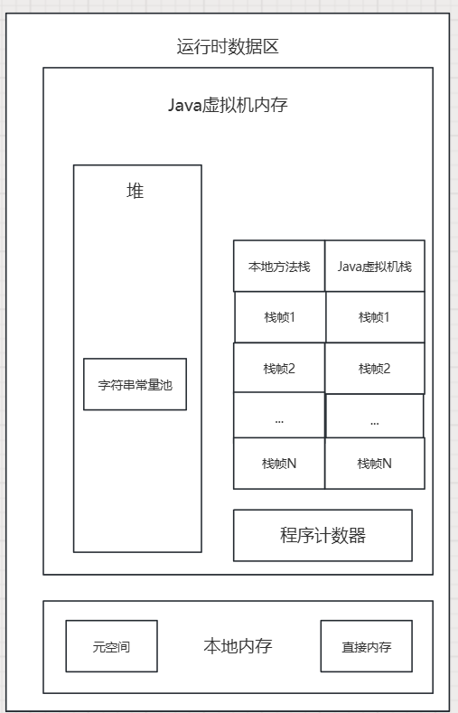 Java 源代码文件经过编译器编译后会生成字节码文件,经过加载器加载完毕后会交给执行引擎执行。在执行的过程中,JVM 会划出来一块空间来存储程序执行期间需要用到的数据,这块空间一般被称为运行时数据区,见下图。