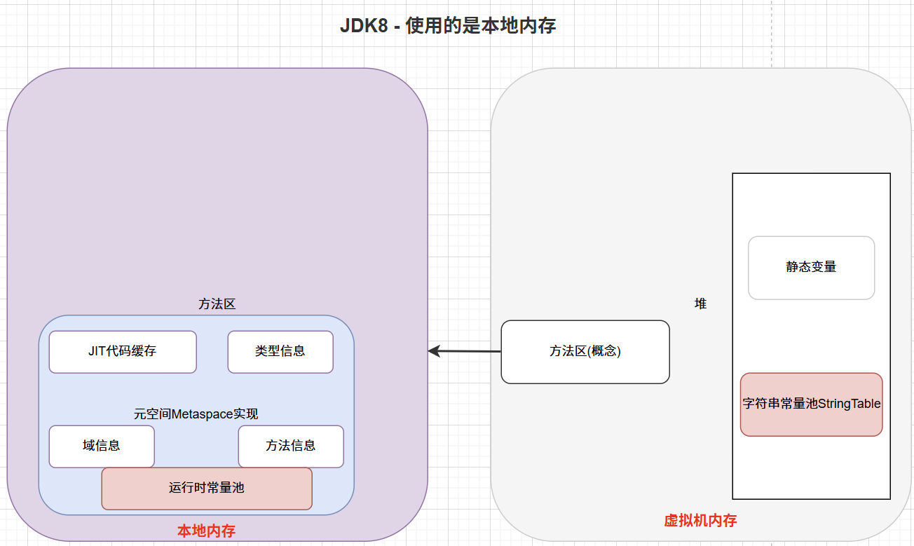 JDK 8 开始,永久代被彻底移除,取而代之的是元空间。元空间不再是 JVM 内存的一部分,而是通过本地内存(Native Memory)来实现的。也就是说,JDK 8 开始,方法区的实现就是元空间。