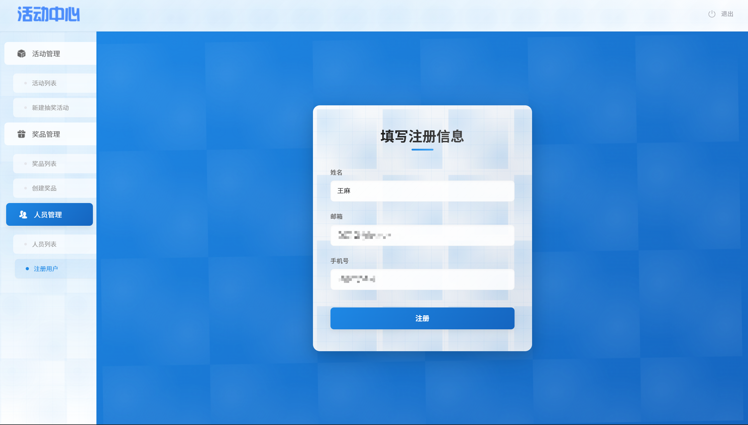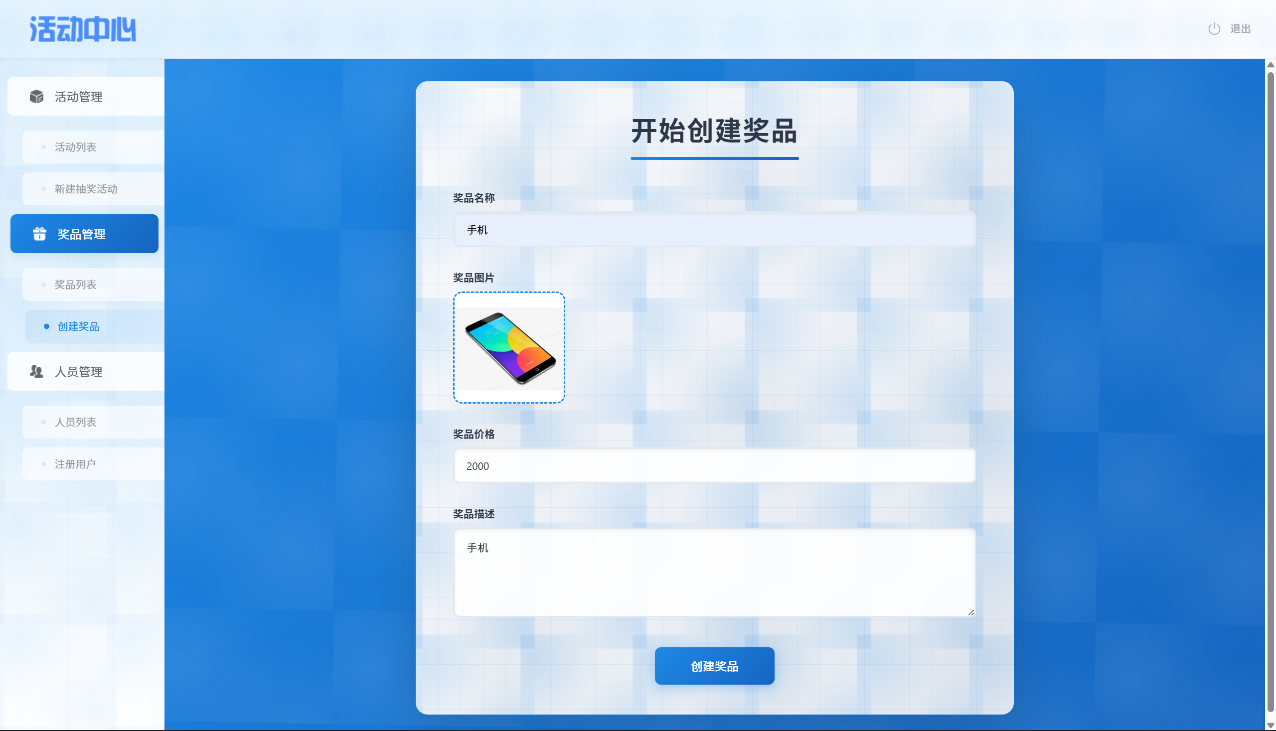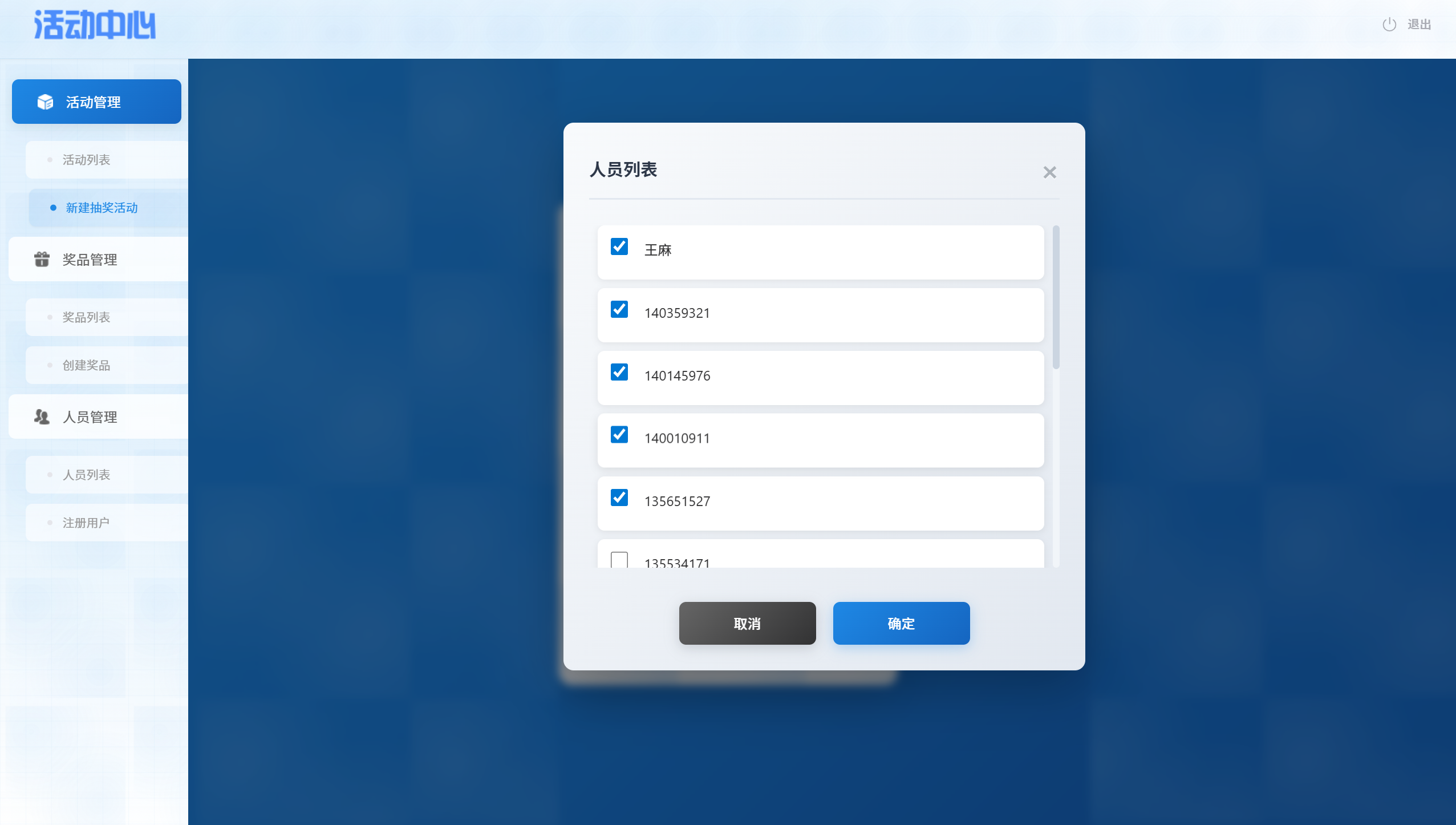 ④ 活动管理:创建抽奖活动(圈选奖品 / 人员、活动名称 / 描述填写)、活动列表新增数据验证、活动链接跳转验证。