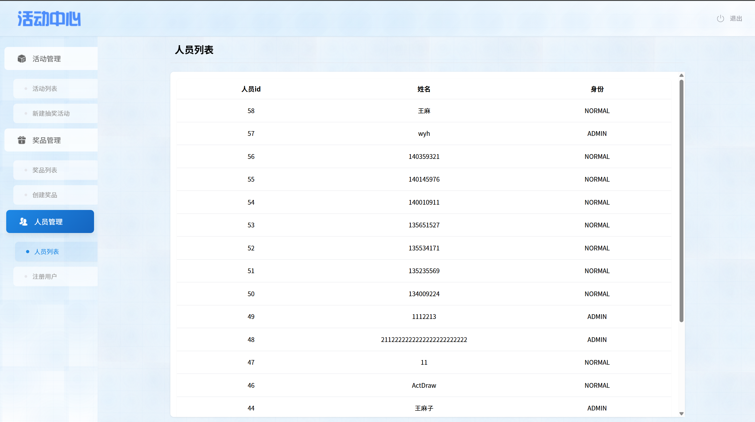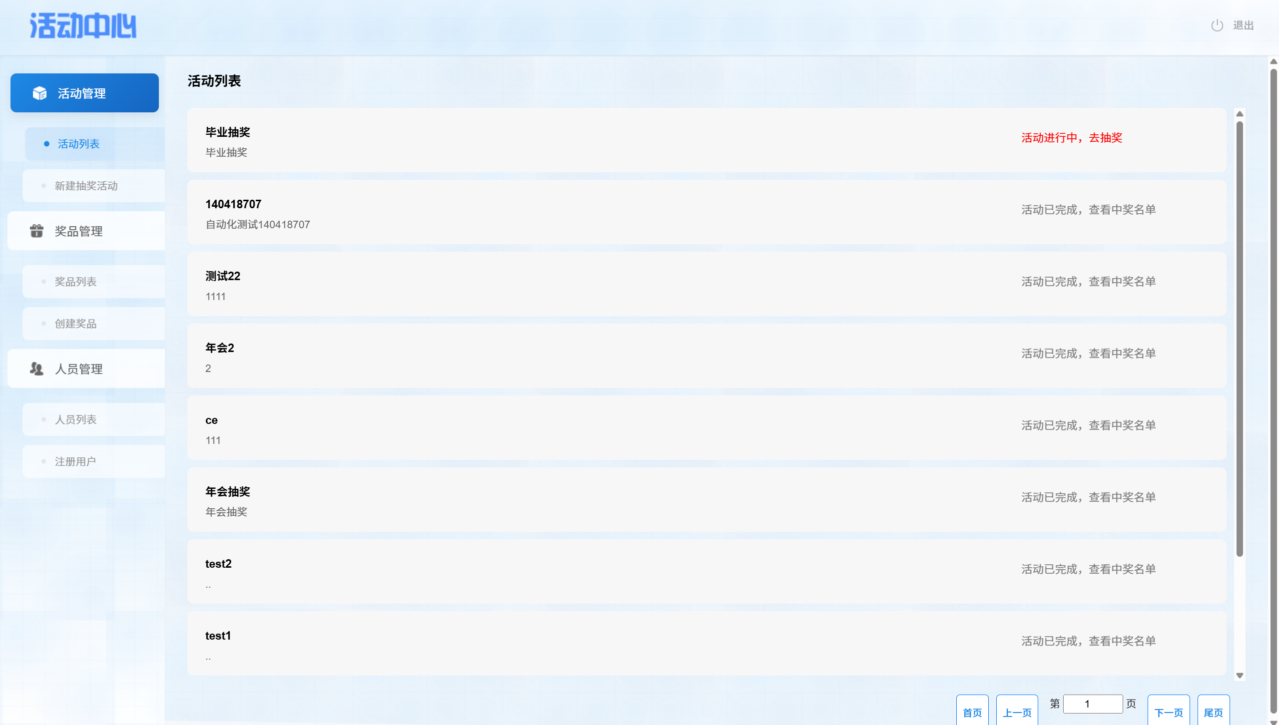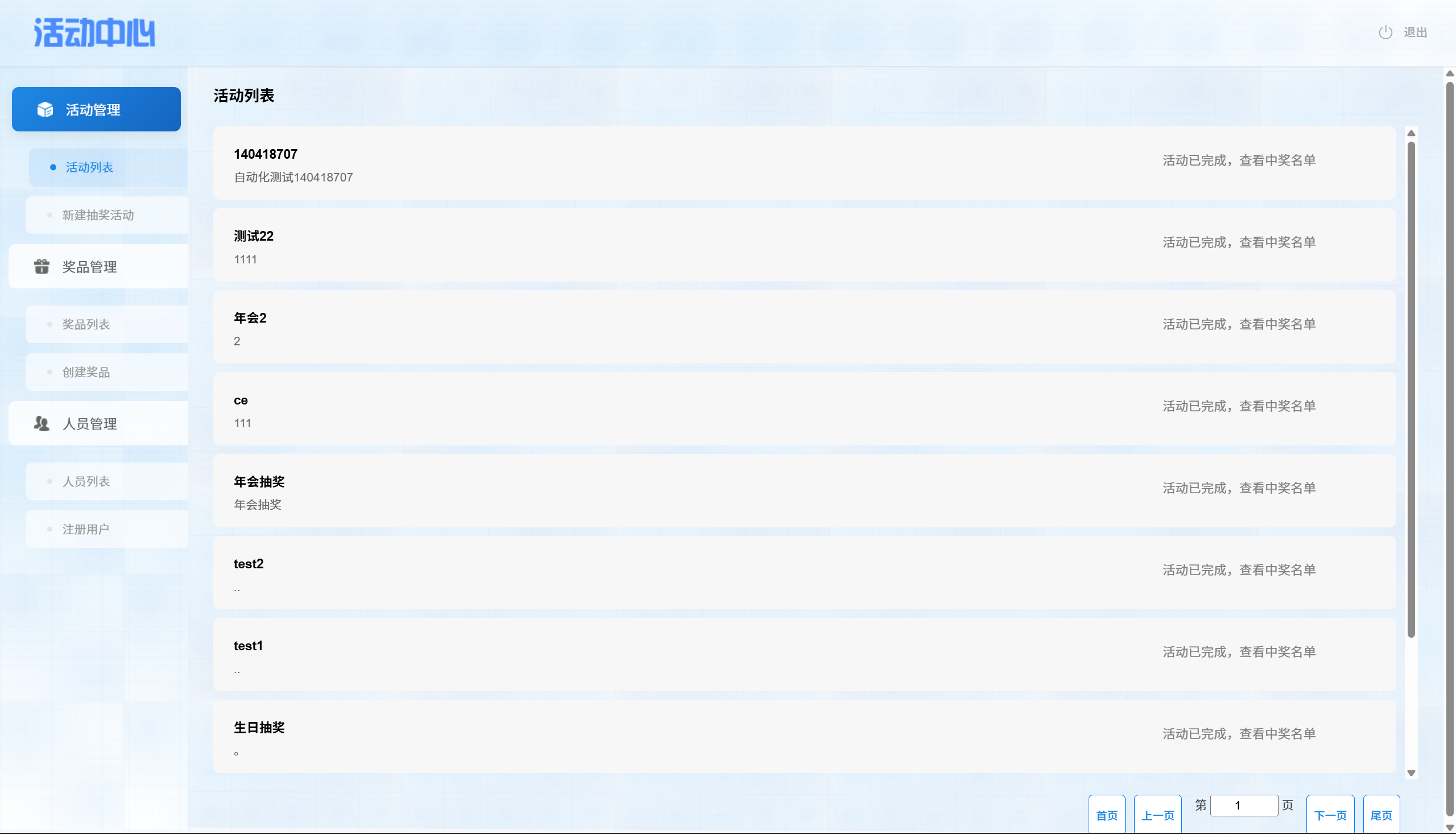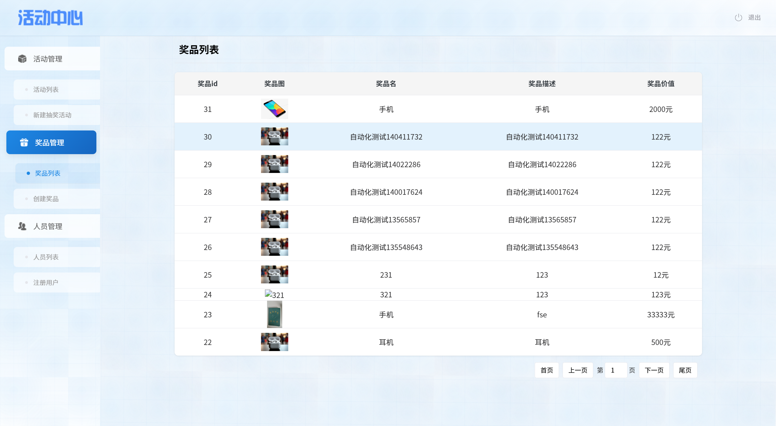 ① 页面正常加载(活动管理 / 奖品管理 / 人员管理等侧边栏元素文本验证);