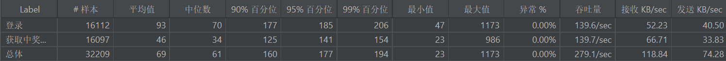 - 获取中奖记录接口:平均响应时间 44ms,90% 请求在 123ms 内完成,性能表现优秀,满足高并发场景下的响应要求。