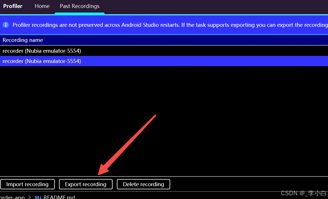 如果习惯使用 Android Studio 的可视化操作,可直接通过 Profiler 生成并导出 trace 文件,步骤如下: