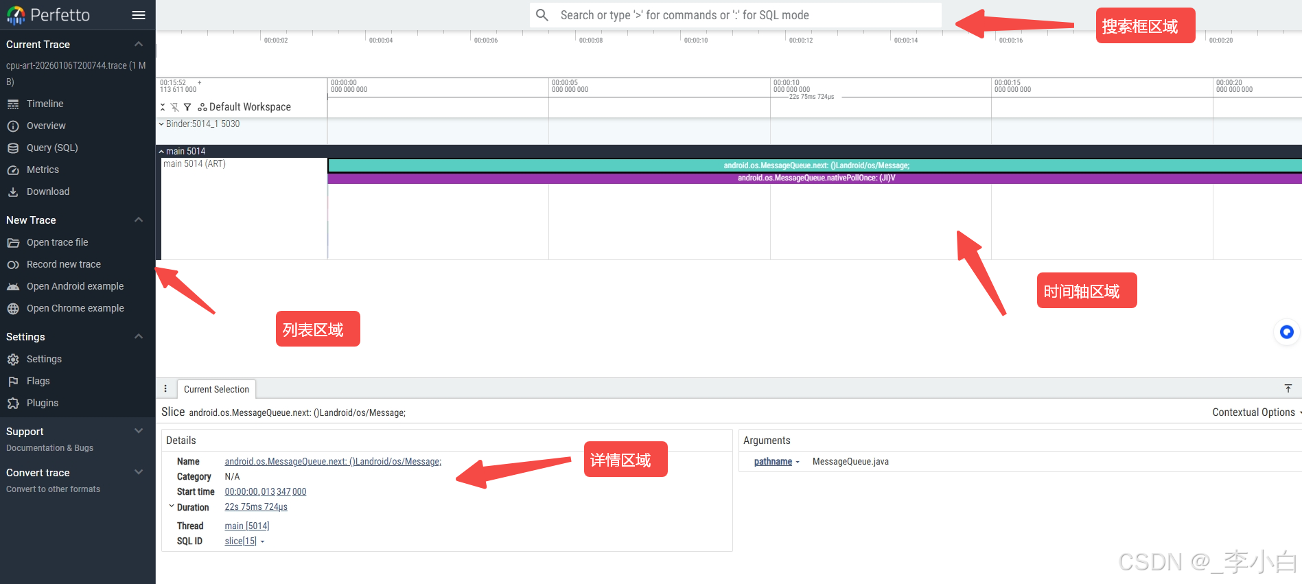 Perfetto UI 是基于浏览器的可视化分析工具,核心优势在于能解析并展示系统级的多维度性能数据,包括 CPU 调度、内存分配、功耗状态、应用方法调用等。