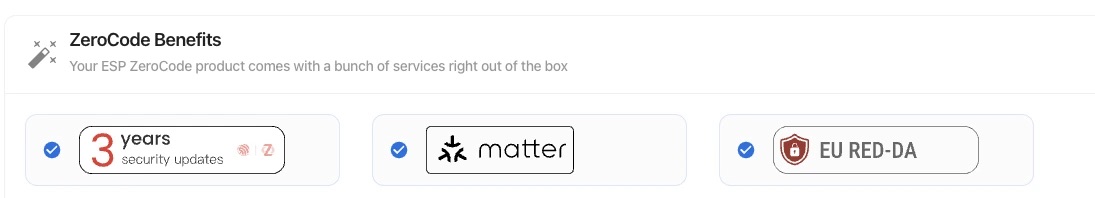 - 针对 ESP-ZeroCode 平台及所选 SoC / 连接方式预填充的合规内容