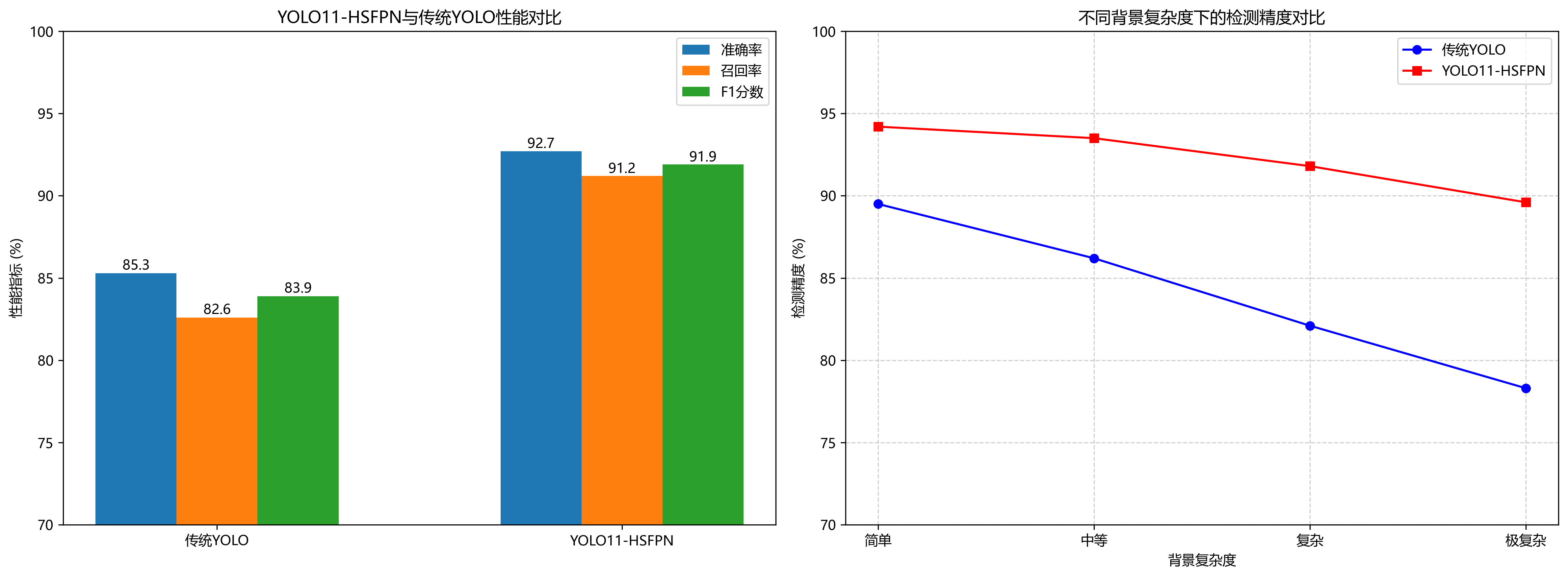从表中可以看出,YOLO11-HSFPN在mAP@0.5上达到91.5%,比对比模型中最优的YOLOv10高出2.6个百分点,同时保持了46FPS的推理速度,满足实时检测需求。