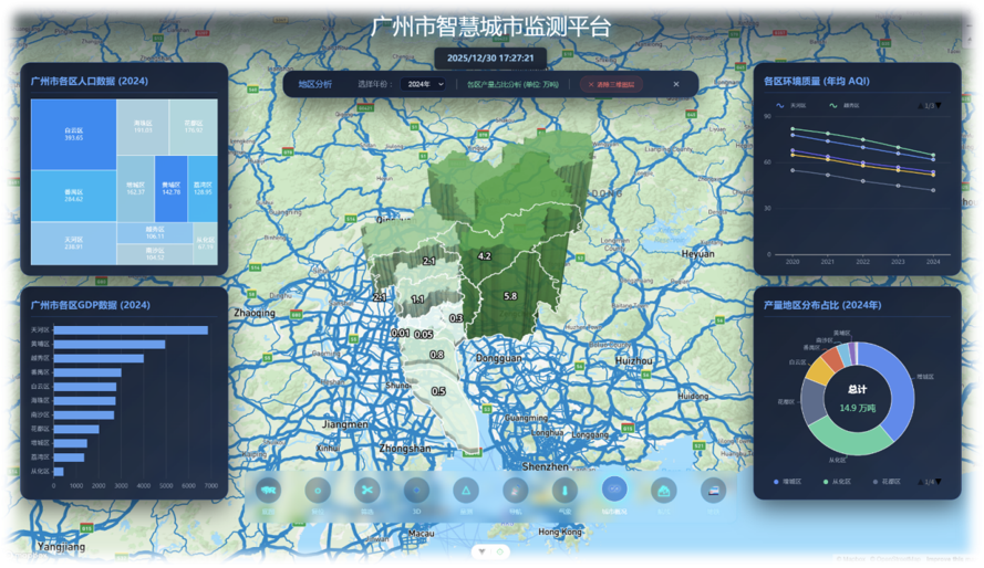 该功能展示了各个区的人口,GDP,环境质量和产量地区分布比,地图上有三维立体展示。