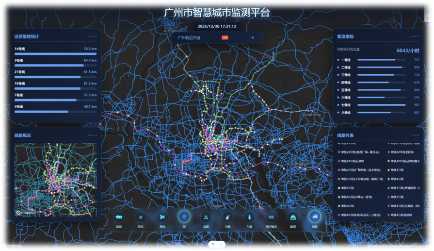 整合广州地铁运营数据,展示地铁线路分布、运营里程统计、客流指标、线路经过地点等核心信息,支持地铁线路查询与可视化展示。