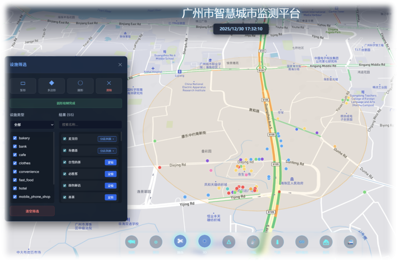 作为智慧城市监测平台的基础交互工具模块,以灵活的空间筛选方式和精准的要素分类能力,为用户提供 "自定义区域 + 精准要素" 的双重筛选服务;紧扣广州超大城市治理中 "精准定位、高效调配、协同联动" 的核心需求,通过灵活的空间筛选与精准的要素分类,破解传统治理中 "信息查找慢、区域定位粗、要素筛选杂" 的痛点。