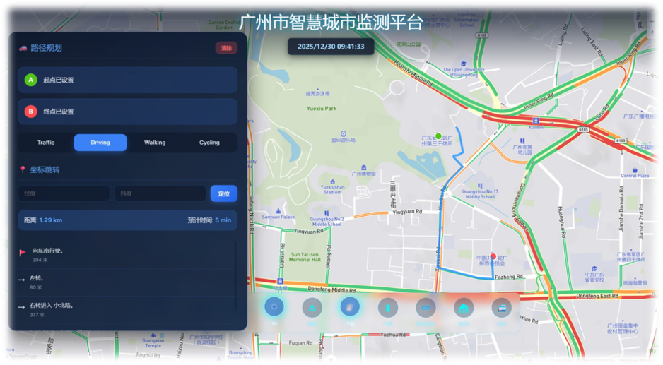 本项目紧扣广州超大城市治理需求,以数字化转型战略为引领,基于 WebGIS 技术构建智慧城市监测平台,通过 "数据 - 功能 - 应用" 三层架构,整合地理、交通、气象等多源数据,实现全域可视化管理。