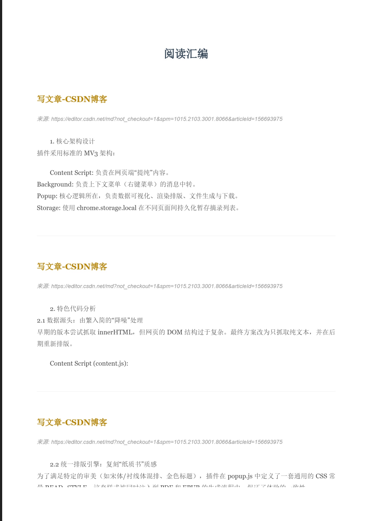 为了满足特定的审美(如宋体/衬线体混排、金色标题),插件在 popup.js 中定义了一套通用的 CSS 常量 READ_STYLE。这套样式被同时注入到 PDF 和 EPUB 的生成流程中,保证了体验的一致性。