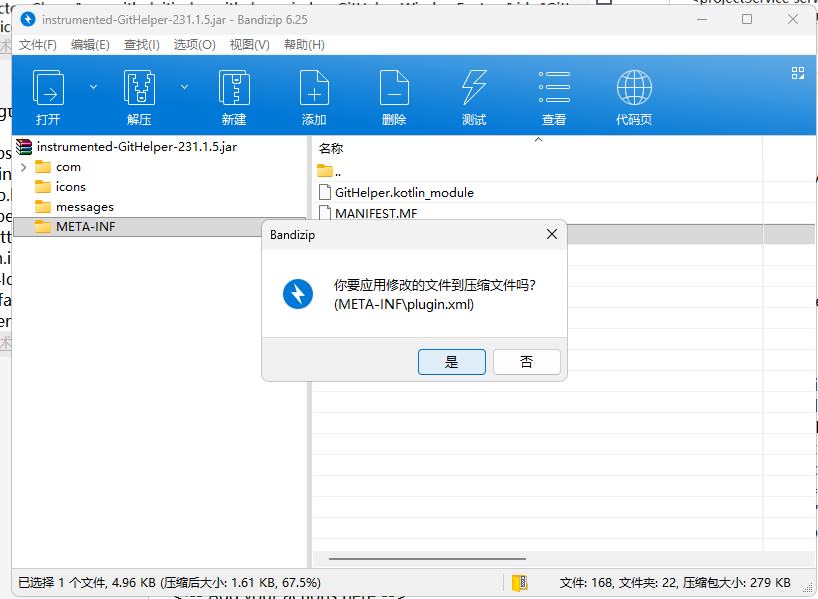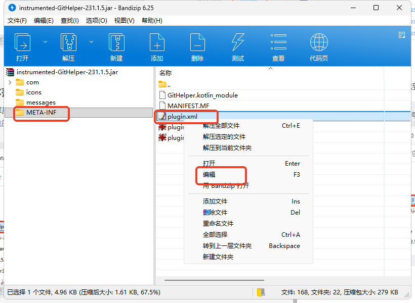 若是解压软件不能直接编辑,可以将jar包后缀改为zip,然后解压,然后直接改这个文件,修改完之后重新压缩为zip包,然后改名为jar包就行(注意,重新压缩里面的文件夹等结构不能变,jar包名不能变)