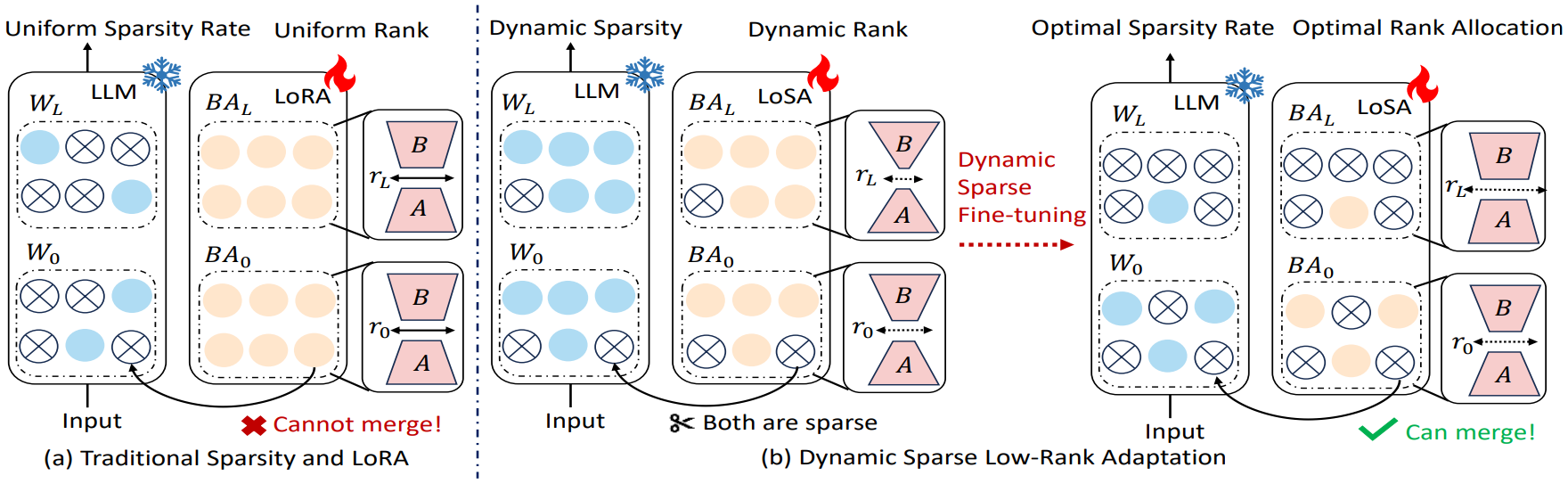 LoRA是经典的PEFT方法,但无法与稀疏模型无缝融合 ------微调后的LoRA低秩矩阵需额外加载,导致推理延迟增加;同时LoRA采用静态秩+均匀稀疏率,未利用模型各层的差异,限制了性能恢复。
