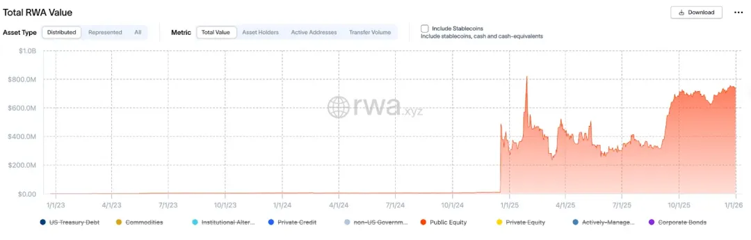 股票代币化正成为 2025 年 RWA 赛道中增长最为显著的细分方向之一。自 2024 年底以来,该领域进入快速扩张阶段,据 rwa.xyz 数据显示,相关资产规模已从接近零增长至约 7.8 亿美元,反映出市场对将上市公司股权引入链上体系的需求正在加速释放。