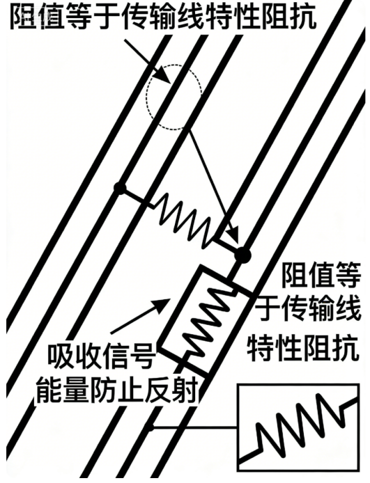 用于传输线(如高速数字线、同轴电缆)的末端,其阻值等于传输线特性阻抗。能吸收到达末端的信号能量,防止信号反射造成波形失真和数据错误。