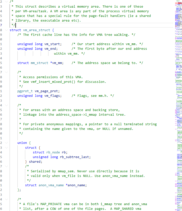 vm_area_struct 结构体定义了虚拟内存区域的属性(参考内核源码注释):