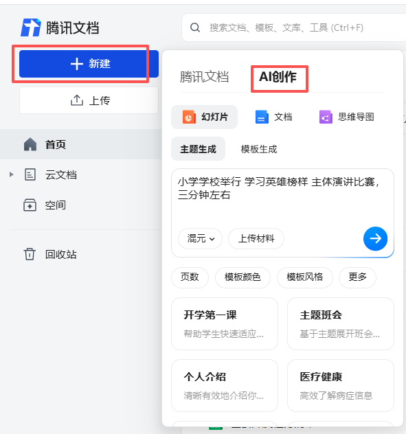 3.1,打开腾讯文档,点击新建,选择ai创作,输入主题或者模板,点击箭头