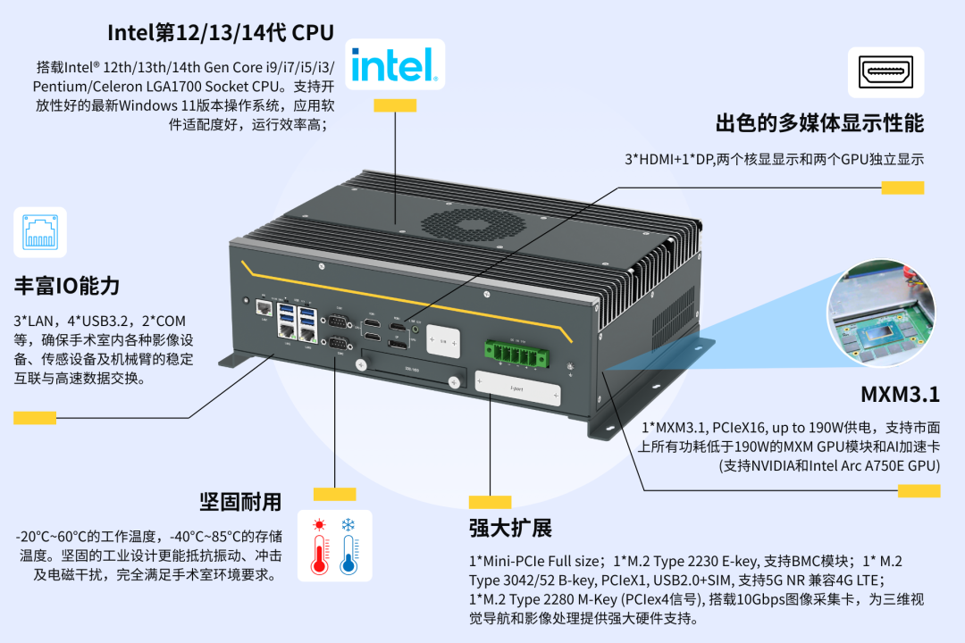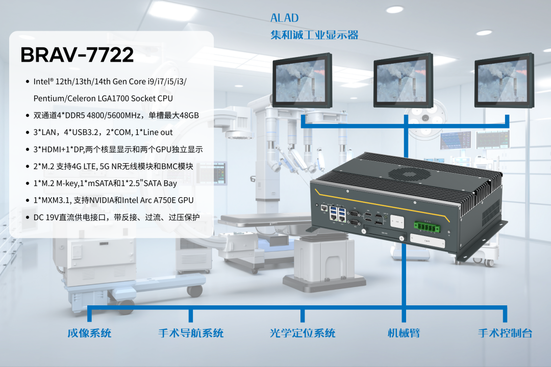 搭载Intel®第12/13/14代高性能处理器,支持DDR5高频内存,提供澎湃算力,确保高效数据处理与实时响应。其出色的多媒体处理性能,通过四独立显示接口支持多屏4K输出,并具有MXM3.1和M.2 PCIeX4扩展槽,可配套MXM GPU AI加速卡和10Gbps图像采集卡,为三维视觉导航和影像处理提供强大硬件支持。同时,BRAV-7722配备了多千兆网口、丰富的USB与串行接口,确保手术室内各种影像设备、传感设备及机械臂的稳定互联与高速数据交换。坚固的工业设计更能抵抗振动、冲击及电磁干扰,完全满足手术室环境要求。作为整体解决方案的一部分,推荐搭配ALAD系列工业级触控显示屏,该显示屏具备高分辨率、宽温工作特性及IP65前面板防护等级,其全平面设计易于消毒清洁,与BRAV-7722控制系统无缝衔接,共同构成一个高性能、高可靠、人机交互出色的手术机器人核心控制平台,为精准、安全的手术操作保驾护航。