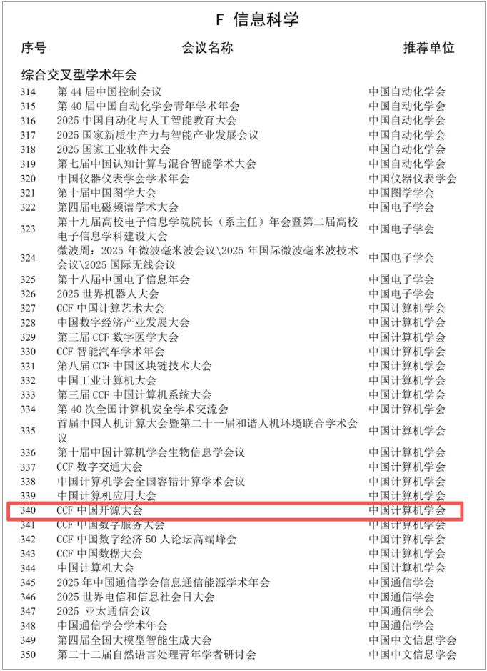 近日,中国科协网官网公布了《重要学术会议目录(2025)》。由中国计算机学会主办,CCF开源发展技术委员会承办的"CCF中国开源大会"入选"F 信息科学 - 综合交叉型学术年会"之列。