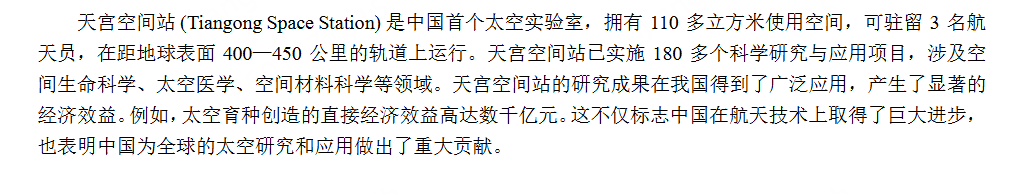 Tiangong Space Station is the first space 实验室不会写 lab in China,which owns more than 110 立方米不会写cubic meter useful space and operates on the 轨道不会写orbit that far from earth 400-450 kilimeters .Tiangong Space Station have already 实施 implementation英文单词不会说 more than 180 technology reasearchs and deploy projects,including many spans like space living techonlogy、tiankong mdedician、space meterial technology and so on.Tiangong Space Station 's research outcome has been used in our country,builds obvious economic goals.for example,space create seed creates economic goals this not only the sample of china has owned big progress in 航天不会 技术不会 space technology,and proves that china build important attribute to global reasrearch and deployment