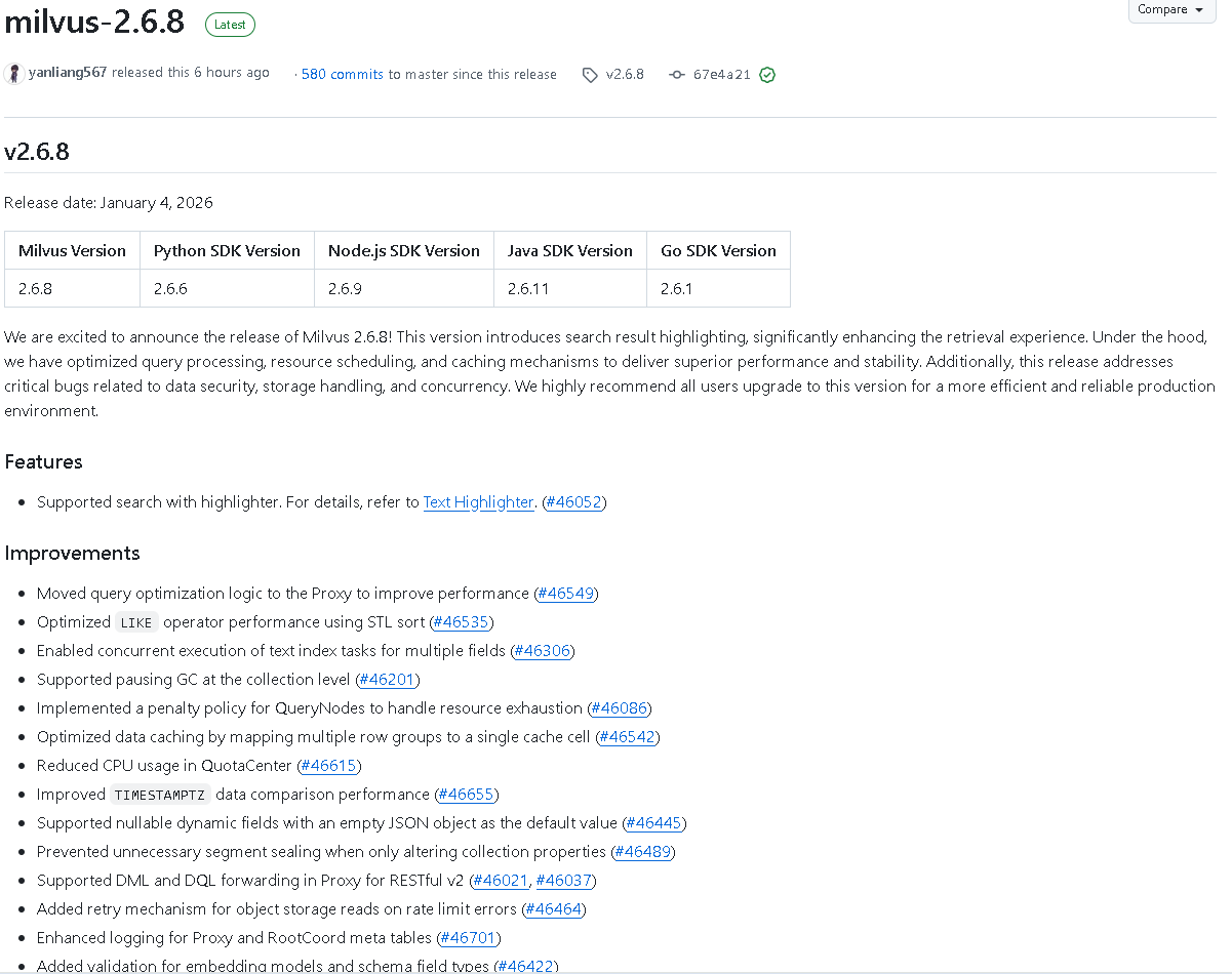 2026 年 1 月 4 日,Milvus 正式发布 v2.6.8 版本。这一版本在搜索体验、系统性能、资源调度和稳定性方面进行了深度优化,同时修复了大量关键问题,是一次非常值得生产环境升级的重要版本。