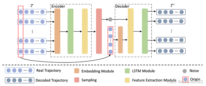 编码器网络用于尽可能地将训练轨迹数据集的分布近似为正态分布,其输出是训练数据的均值向量与标准差向量。编码器网络同样包括三个模块:嵌入模块、LSTM模块和特征提取模块。随后,噪声分布与特定起点一起作为解码器网络的输入。