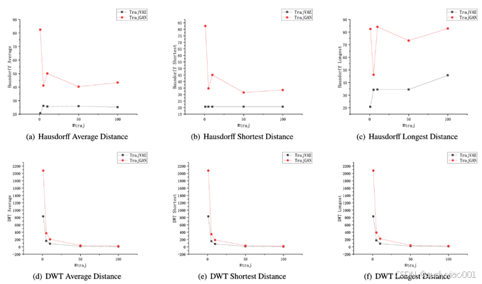 从图3可以看出,随着生成轨迹数量的增加,TrajVAE表现出更稳定的趋势。针对该现象,文中提出了以下几点原因: