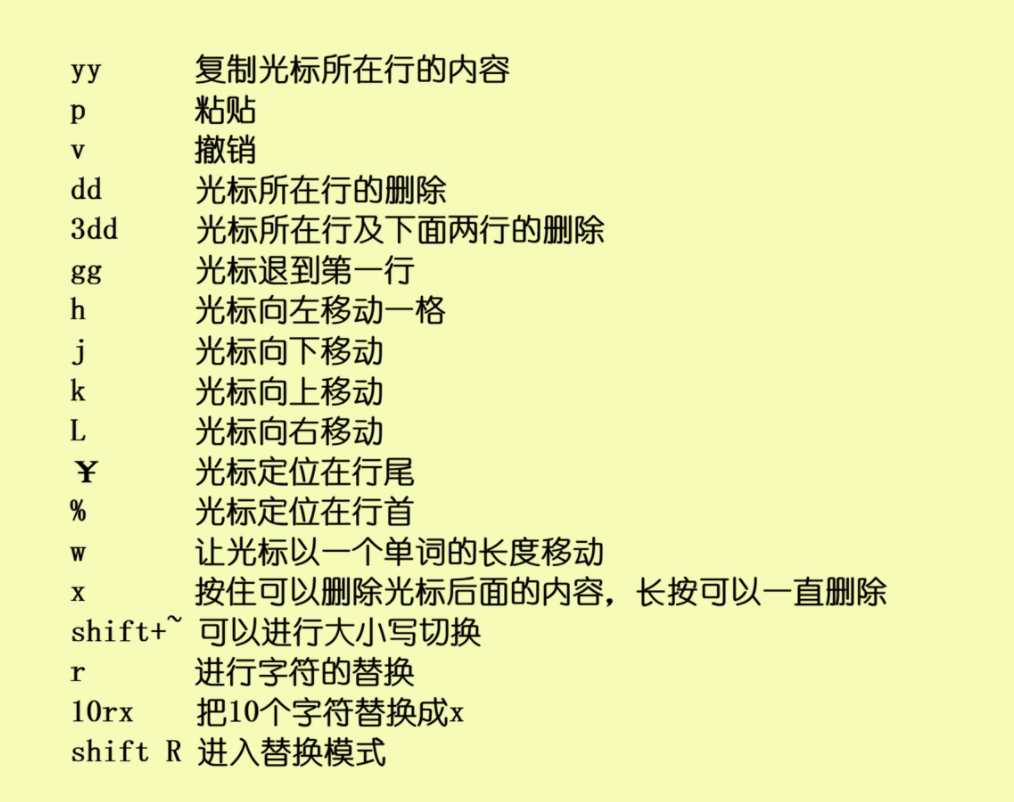 ①命令模式:命令模式是Vim的"指挥中心",让你用快捷键批量操作文本,脱离鼠标实现极速编辑。值得注意的是我们刚进入文件中就是处于命令模式;以下是命令模式下快捷键的作用;