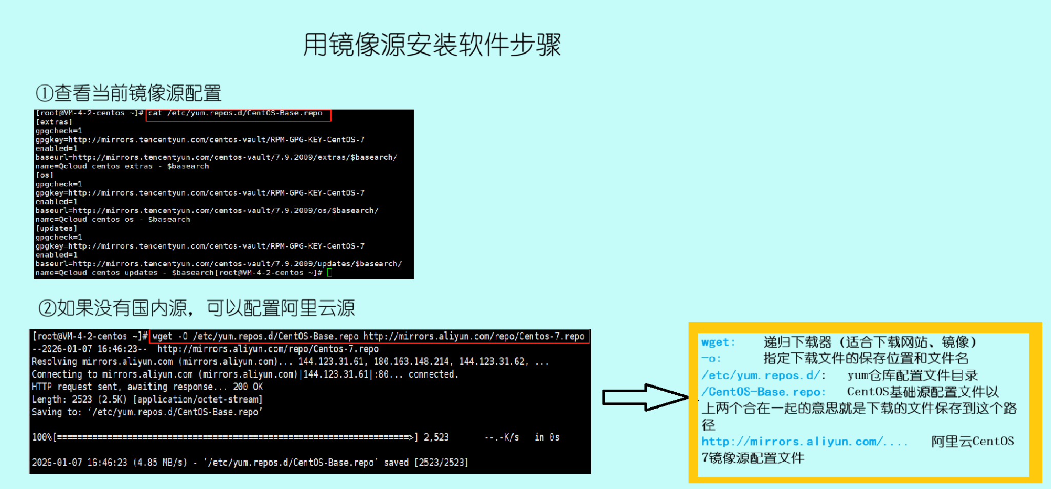 镜像源: 镜像源是CentOS安装源的"完整副本",镜像源不是"补充",而是软件的主要来源地。系统本身只是个"空架子+基础配置",大部分软件都要从镜像源获取。