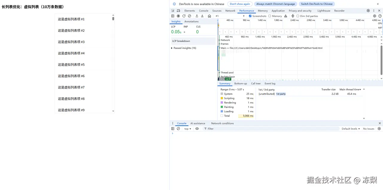 使用虚拟列表优化的长列表Rendering耗时1ms,Painting耗时1ms。大大缩短了渲染时间。