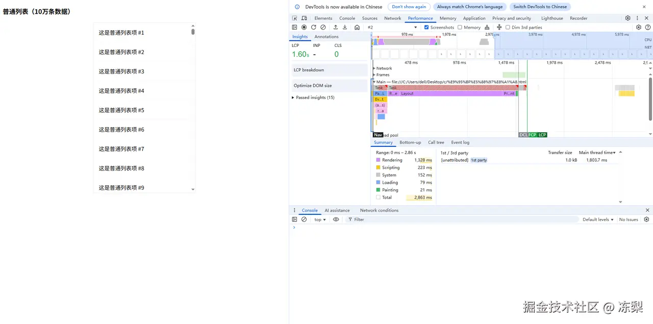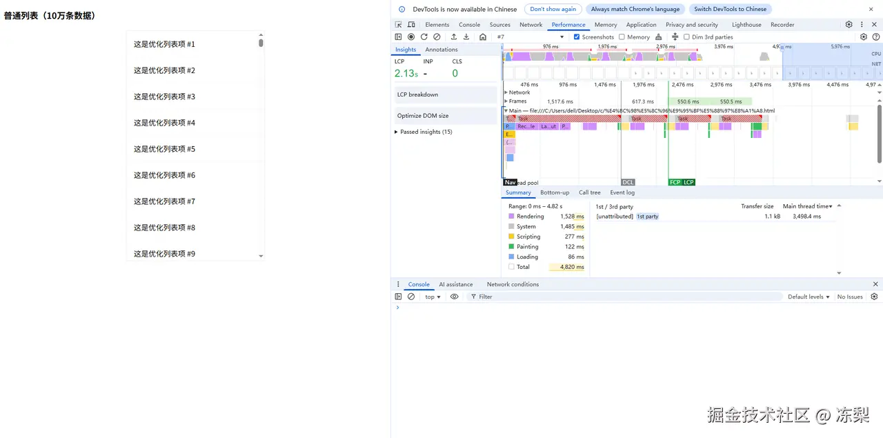 使用了content-visibility优化的长列表Rendering耗时1528ms,Painting耗时122ms。可以看到竟然变成了反向优化,渲染时间反而增加。