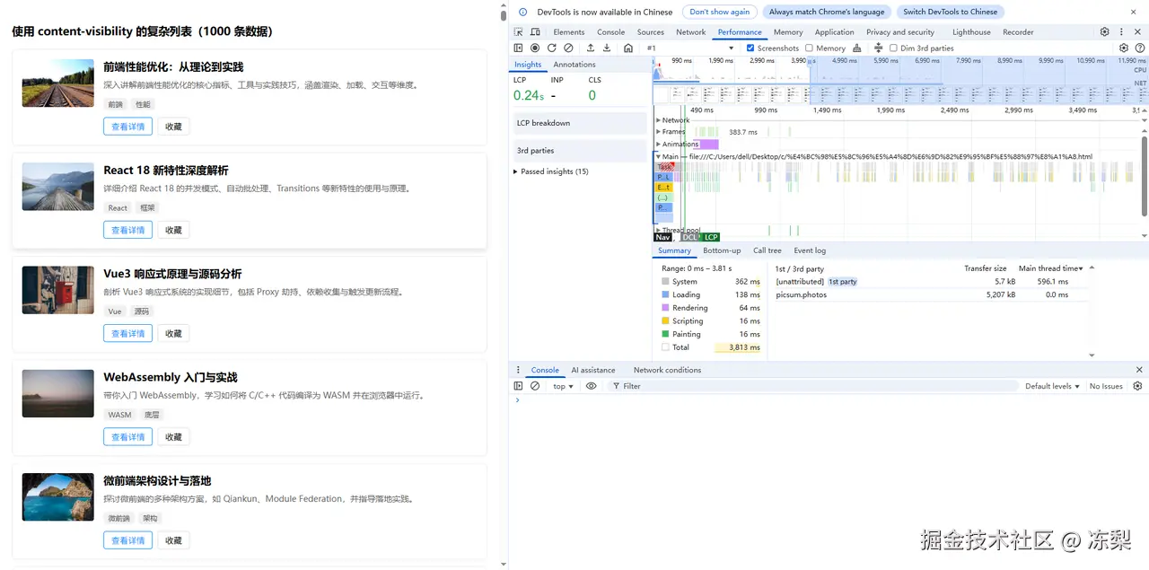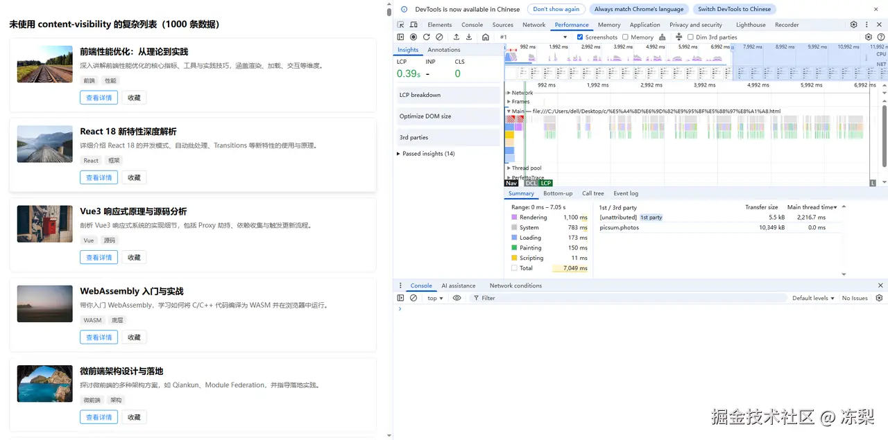 对于本身渲染成本低的元素(如简单文本、小图标),添加content-visibility: auto可能不会提升性能,反而会增加浏览器的可见性判断成本。接下来比较包含图片和复杂样式的列表项。