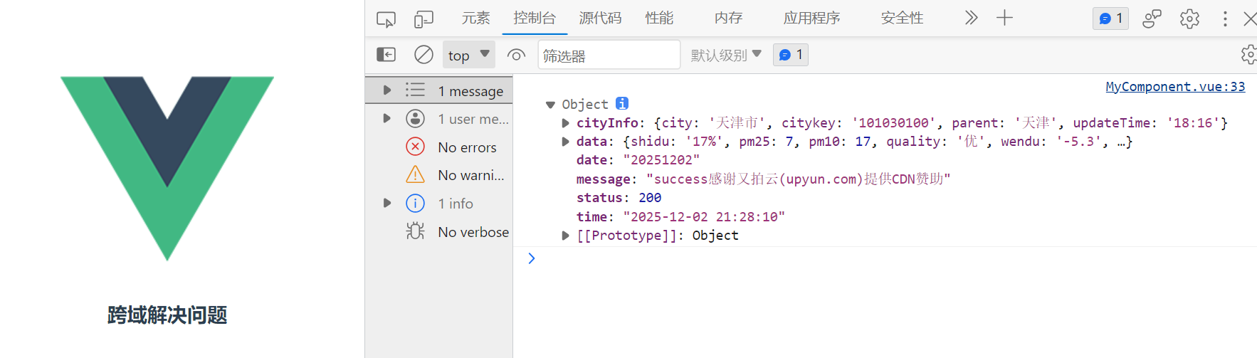 //axios.get("http://t.weather.sojson.com/api/weather/city/101030100")产生跨越