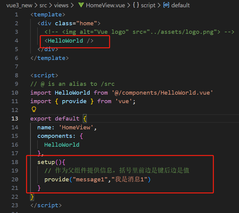 在根组件App.vue中定义一个变量存入字符串,想将根组件数据传到其他组件中使用并在页面中显示