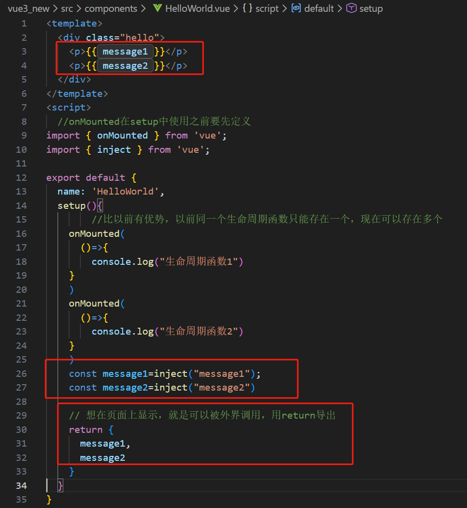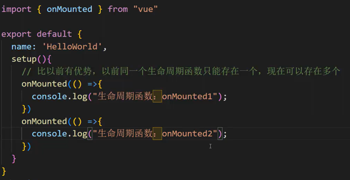 之前mounted函数在一个组件中只能放一个mounted(){},现在放在setup中可以放多个同样的生命周期函数,不同业务可以放在不同函数里,使业务更清晰