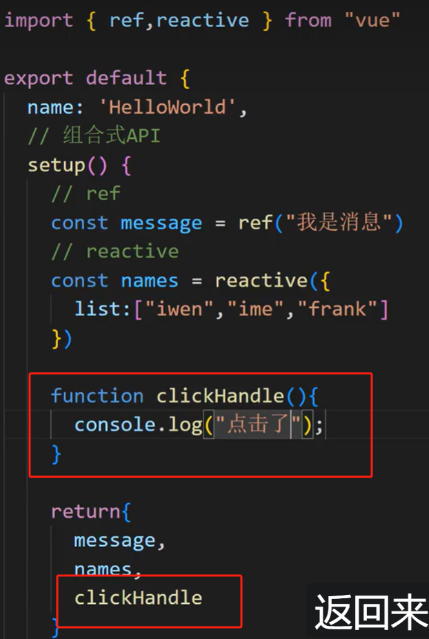 若是事件放在setup中,则不再用methods,在setup定义函数事件,并将函数放在return中,运行外部访问